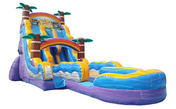 Our New 22' High Tiki Plunge Slide features a 22' tall giant dual-lane inflatable slide with a slip-and-slide lane and splash zone at the end. Once at the top of the awesome slide, the steep angle will have your adrenaline pumping and wanting more! This ride is perfect for schools, churches, summer camps, and backyard parties too. Kids of all ages, including teenagers, will love this ride! Pair this slide up with a summer snow cone machine rental and you will have the ultimate party!