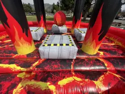 (4) Players climb atop their foam pads. One of the players grabs the “Wrecking Ball” and hurls it at their opponent in an attempt to knock the player off of their pad. As the Wrecking Ball swings back, try and grab it! The player, who grabs it first, then hurls it at another player, trying to knock that player off. The last player standing is the champion. Don’t fall off. It’s HOT!