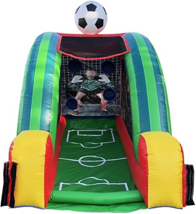 Our Soccer Challenge inflatable game puts players in competitive mode. Participants take their shot at the back wall and try to get it past the goalie to score points through the different openings. The soccer ball then returns to the player's lane. The fast-paced inflatable game includes soccer field artwork in the background that brings the sport to your own backyard!