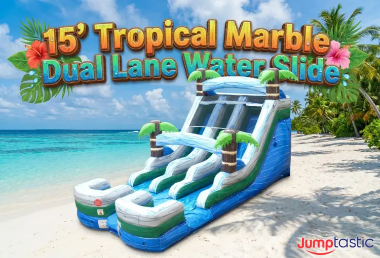Our 15' Tropical Marble Dual Lane Water Slide will take your next party or event to the next level. This incredible water slide rental boasts a two-lane option that allows for races between participants sliding down its sides. With eye-catching blue coloring and thrilling design, this slide is perfect for all types of events, from birthdays to school functions. Kids and adults alike will be thrilled when they see the Tropical Marble on your next occasion!