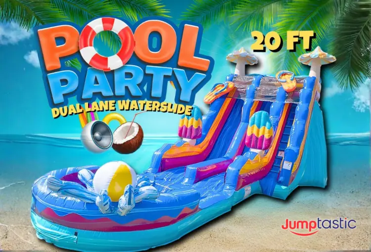 Make a splash this summer with our brand-new 20' Dual Lane Pool Party Waterslide!