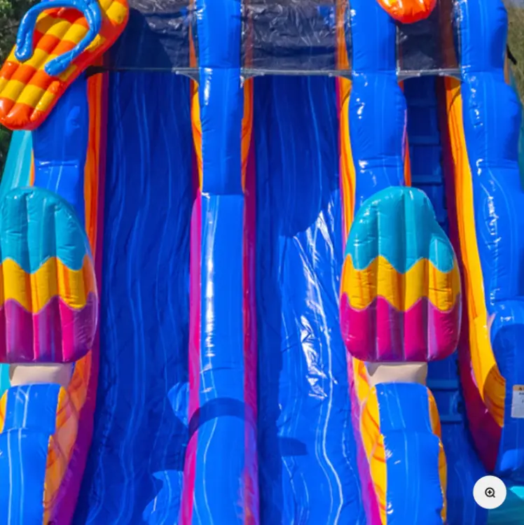 Double the lanes means double the fun — race your friends down two slippery lanes and dive into the refreshing splash pool below! Perfect for birthdays, block parties, and backyard celebrations, this inflatable slide brings the ultimate water park experience right to your home.