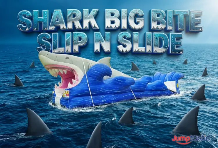 Introducing the Shark Big Bite Slip-n-Slide from Bounce House Atlanta! This slip-n-slide is perfect for your next big day. Your kids will have a blast sliding down this 33' Slip N Slide!